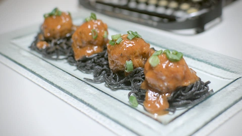 Tallarines de arroz recién cocidos y salteados con verduras, solomillo de cerdo y langostinos, todo ello aderezado con salsa de soja y alga nori.